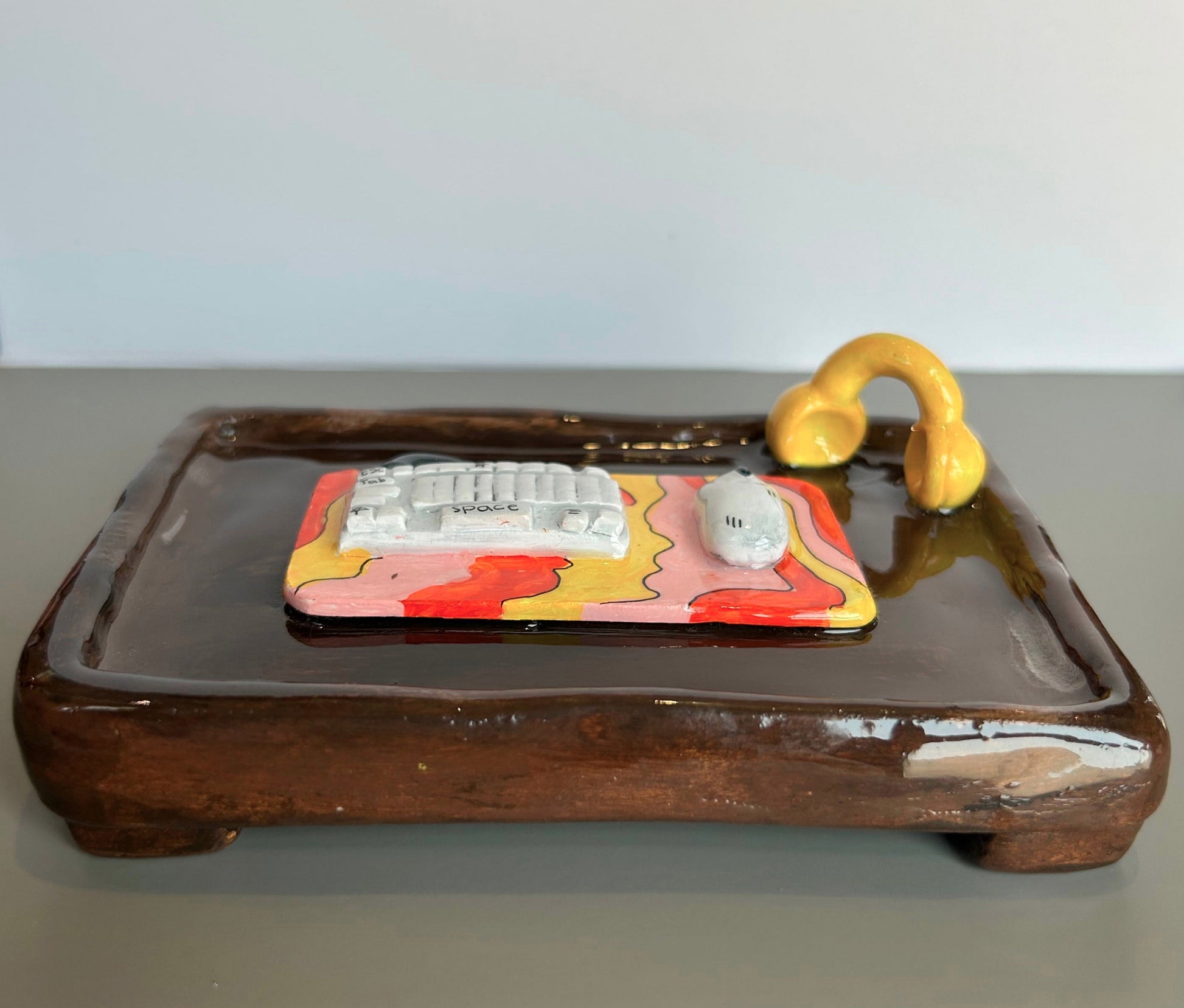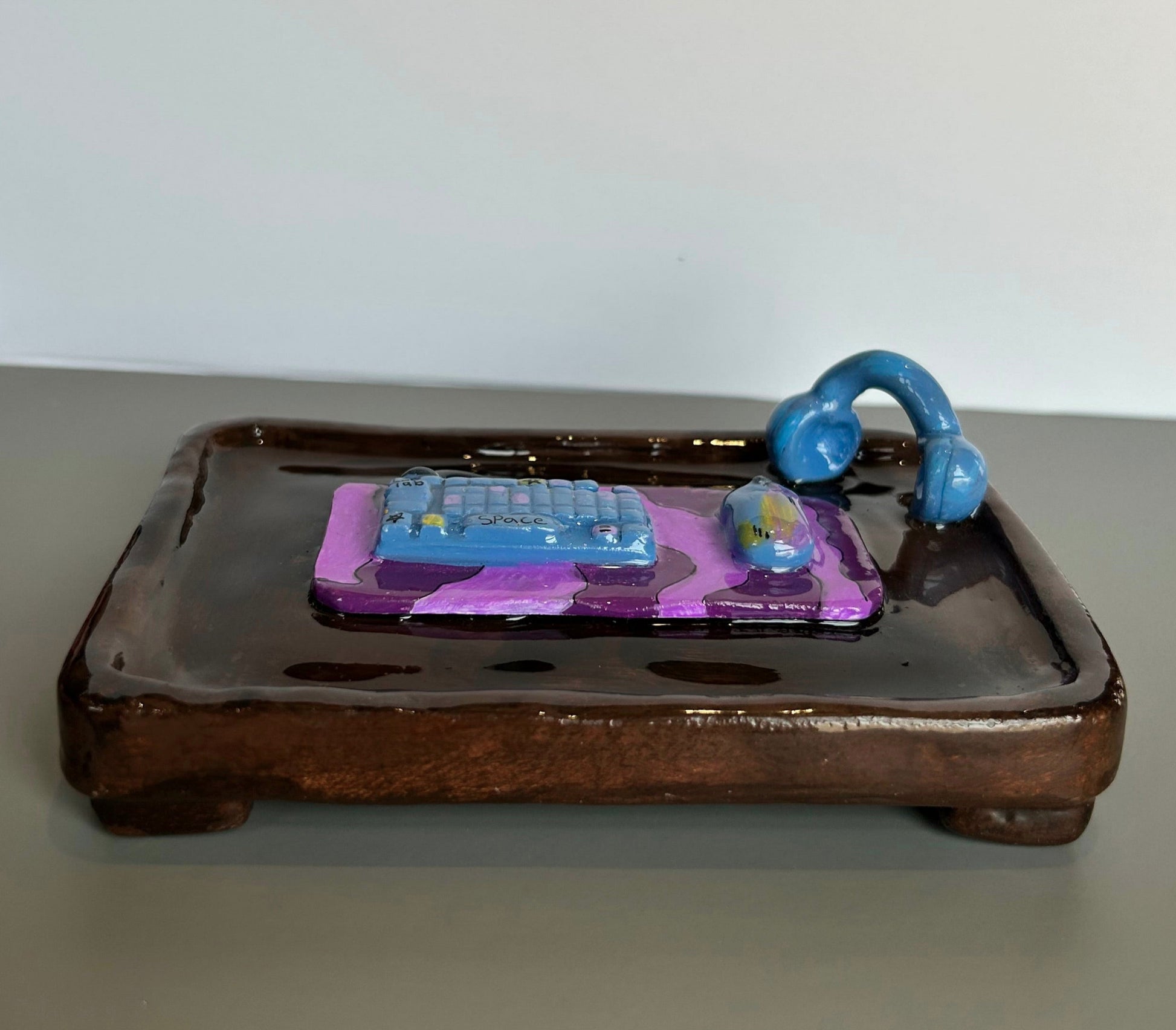 Handmade with love and gamer vibes, this mini trinket dish features a tiny setup—keyboard, mouse, mouse pad, and headset—all on a cute little desk. Perfect for holding small items like rings, pins, or dice. A must-have for gamers who want their setup to shine, even in miniature!