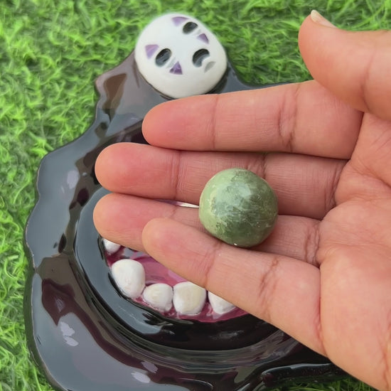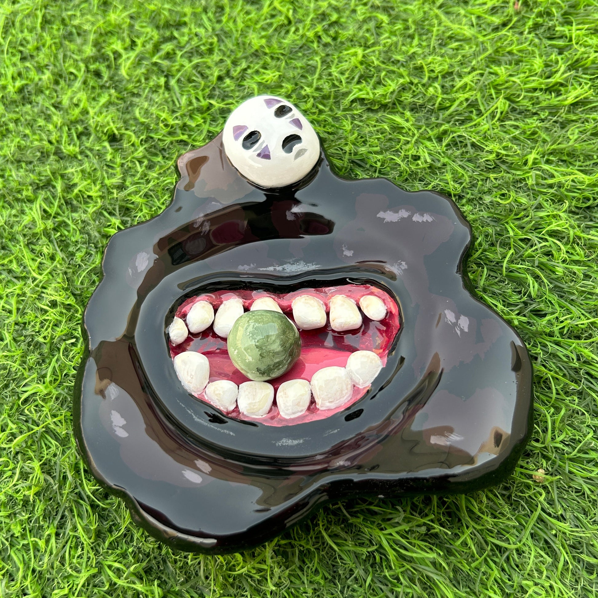 A striking handmade piece inspired by one of the most intense moments in Spirited Away! This No Face Spirit trinket dish captures his hostile transformation, complete with wide jaws and a removable magnetic emetic dumpling – just like the one Chihiro gave him to purge all the negative influences. 💜